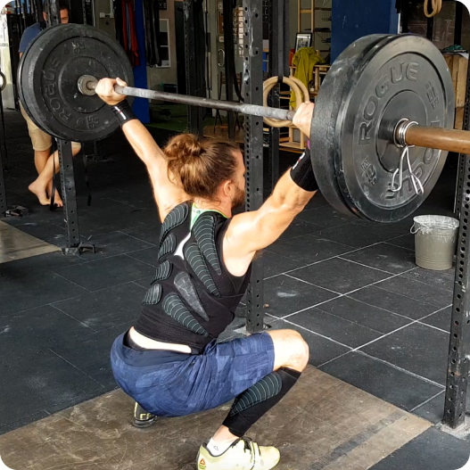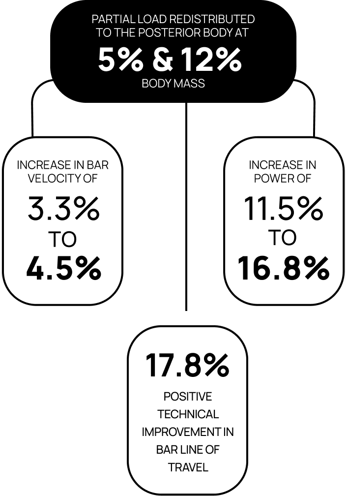 9 recreational trained males performed two reps of the power clean at 50% and 70% of their 1-rep max, both normally, and then with partial load redistributed (5%, 12% body mass) from the bar to the posterior body via Exogen wearable resistance. The total weight remained the same.