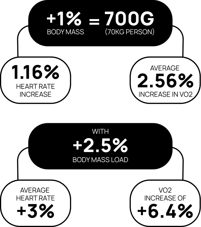 At just 2.5% additional body mass we see large increases in VO2 Max and heart rate.