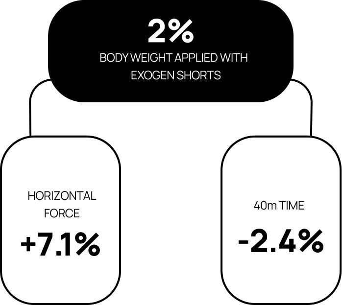 One elite male sprinter, with 100m time of 10.90s undertook a five-week intervention with Exogen wearable resistance, loading 2% body mass to the thighs. The athlete completed two to three sprint sessions per week.